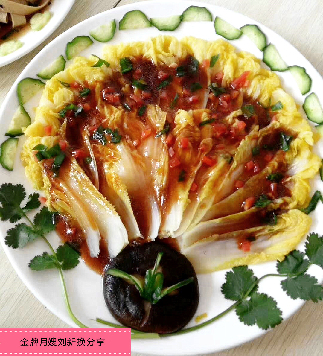 食材:娃娃菜、黃瓜、香菇、小蔥、紅蘿卜、火腿腸、香菜、蠔油、香油、生抽、水淀粉。