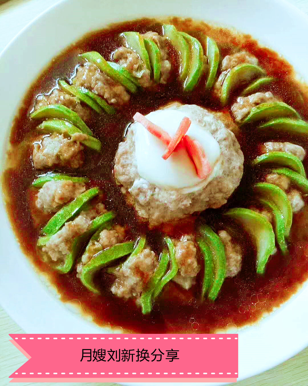 3、西葫蘆片與肉餡按層次擺盤,排盤中央打入一個雞蛋。