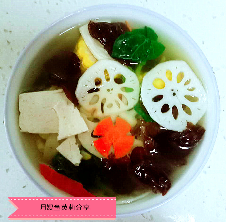 食材:豆腐、木耳、蓮藕、玉米、胡蘿卜、青菜、鹽、芝麻香油、雞湯(排骨湯等),如不喜肉湯可加雞精調味。