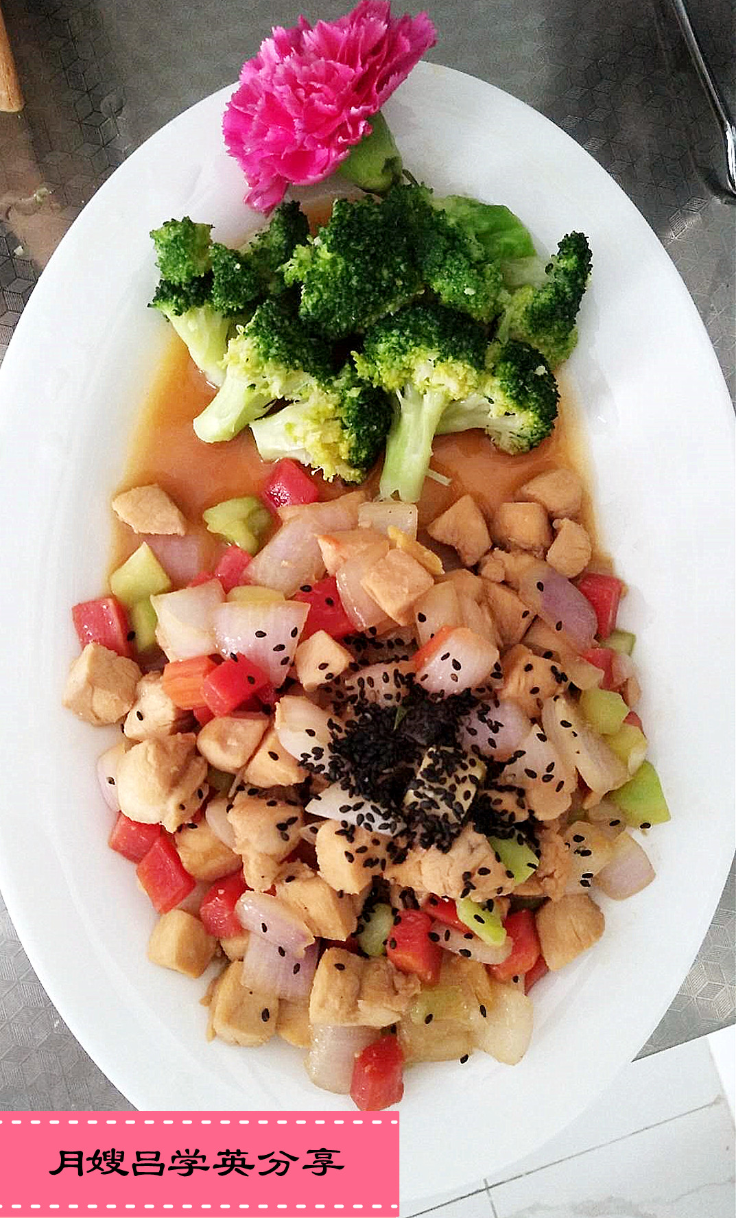 5、熱油依次加入紅蘿卜、洋蔥、半熟雞肉,加入鹽、蠔油調味,最后加入青筍丁,灑上黑芝麻出鍋擺盤。