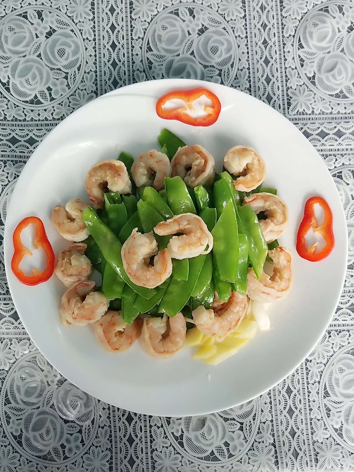 食材:活蝦、荷蘭豆、蔥、姜、蒜、紅炮椒、鹽。