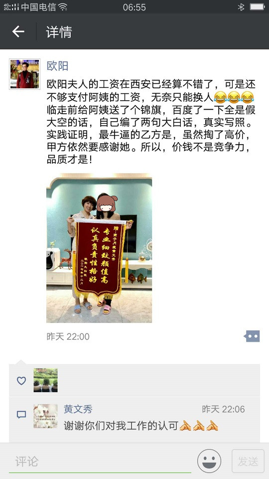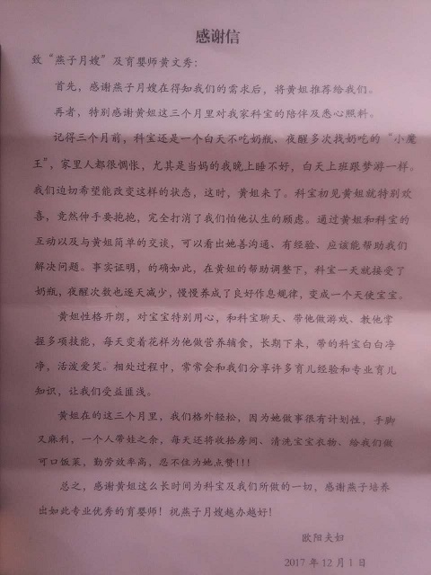 您的支持和信賴是燕子老師最大的動力和信心。非常感謝您對燕子月嫂公司黃文秀的認可,對燕子月嫂公司的肯定,燕子月嫂公司會繼續努力,為更多的媽媽和寶寶提供專業的護理。
