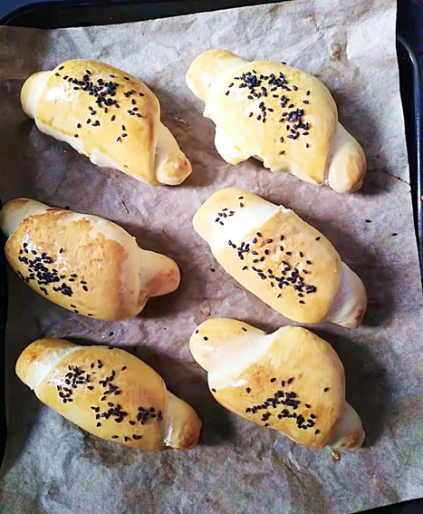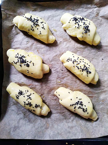 7:放在烤盤里二次發(fā)酵,同時預熱烤箱,把蛋黃液均勻的刷到牛角包上,然后撒上少許黑芝麻。