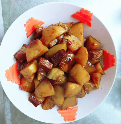 2.鍋里面倒入少許油,下土豆塊,煸制金黃,盛出備用。