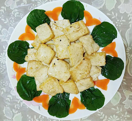 4 鍋里倒入少許油燒熱放入蒜片爆香后倒入炸好的豆腐放少許鹽和適量生抽翻炒兩三下出鍋擺盤。