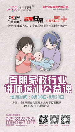 西安燕子月嫂為完善專業系統的母嬰護理技術,定于本月18日-20日開展“燕子月嫂首期家政行業講師培訓”!本期培訓課程分兩個主題:《家政服務與管理》《講師授課方式及技巧》。豐富的內容給有意從事家政培訓行業的朋友們一次完美轉型的機會,公益課堂招收學員數量有限,請各位莫失良機!