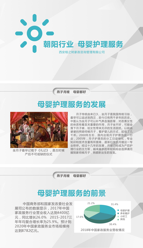 目前,我國母嬰服務行業屬于新興行業,剛剛起步,月嫂需求與供給量的缺口巨大,正規的母嬰服務機構少之又少。隨之而來的是市場對于專業育嬰師的需要到了供不應求的階段,全國個大中城市育嬰服務市場全線告急,蘊藏了巨大的商機。此外,母嬰公司背后還蘊藏著一條巨大的產業鏈。除提供產后產婦及新生兒護理外,還有嬰兒紀念品(胎毛筆等)、嬰兒攝影、嬰兒游泳、母嬰用品、早教、產后恢復等一系列的增長點。