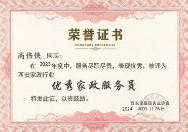 西安燕子育嬰師高偉俠評為西安家政行業“優秀家政服務員”