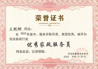 西安燕子月嫂王妮娜評為西安家政行業“優秀家政服務員”
