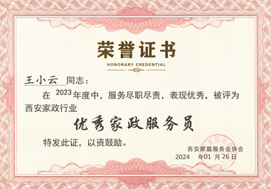 西安燕子育嬰師王小云評為西安家政行業“優秀家政服務員”