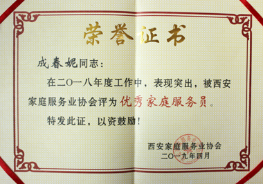 成春妮榮獲家協“優秀家庭服務員”稱號
