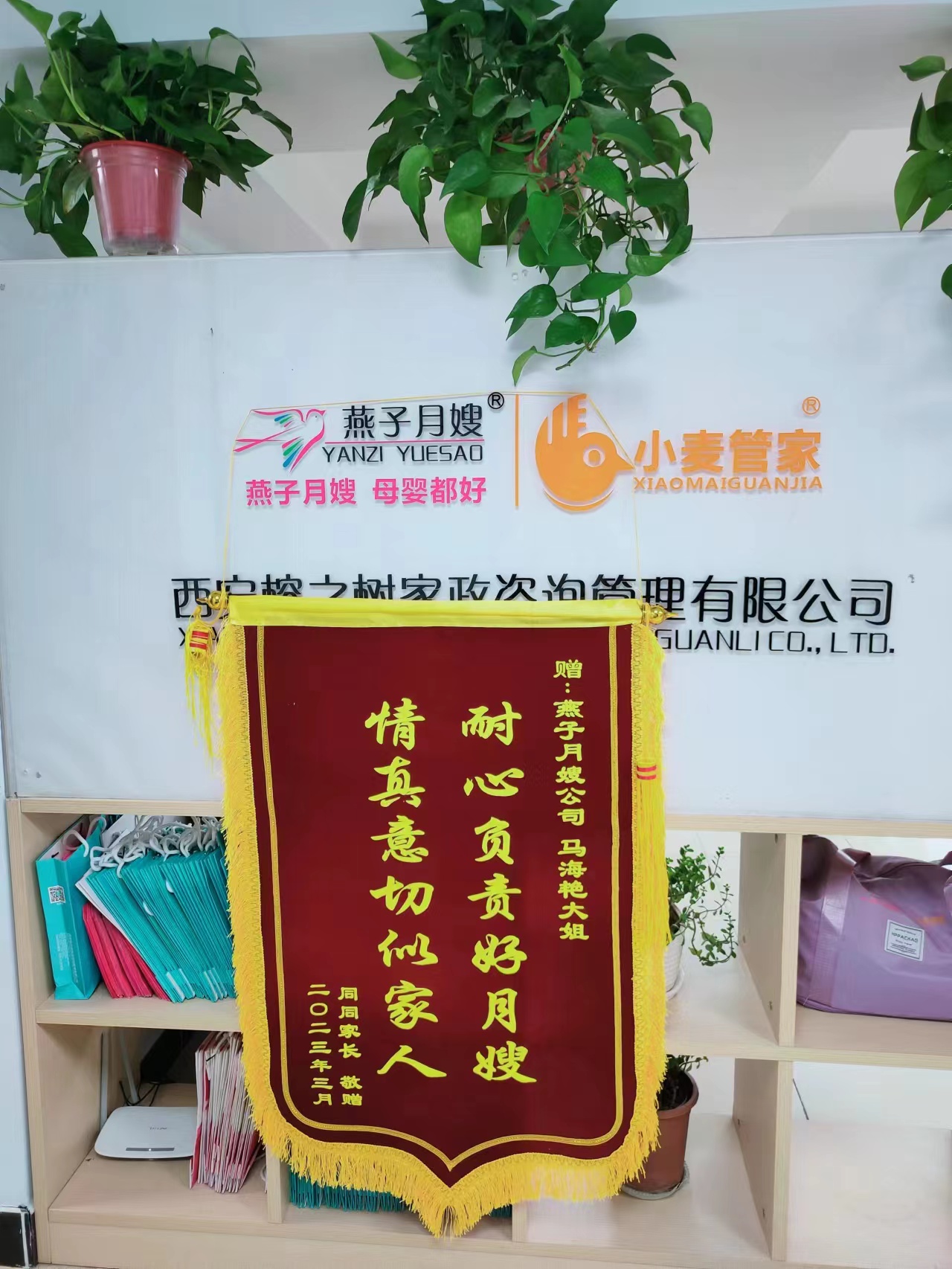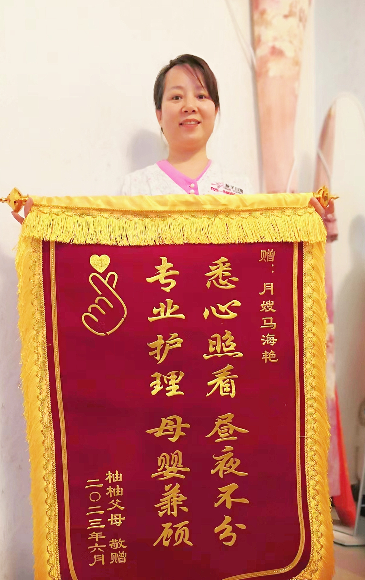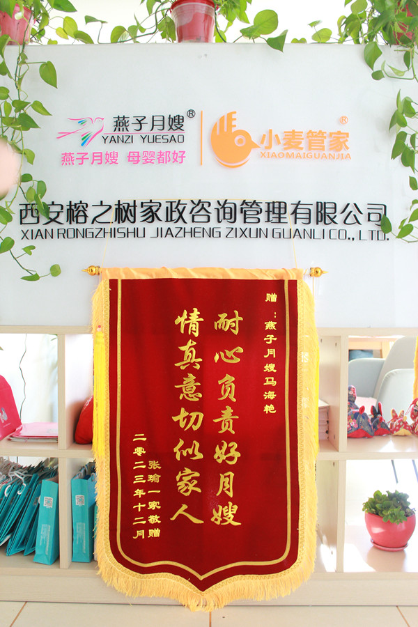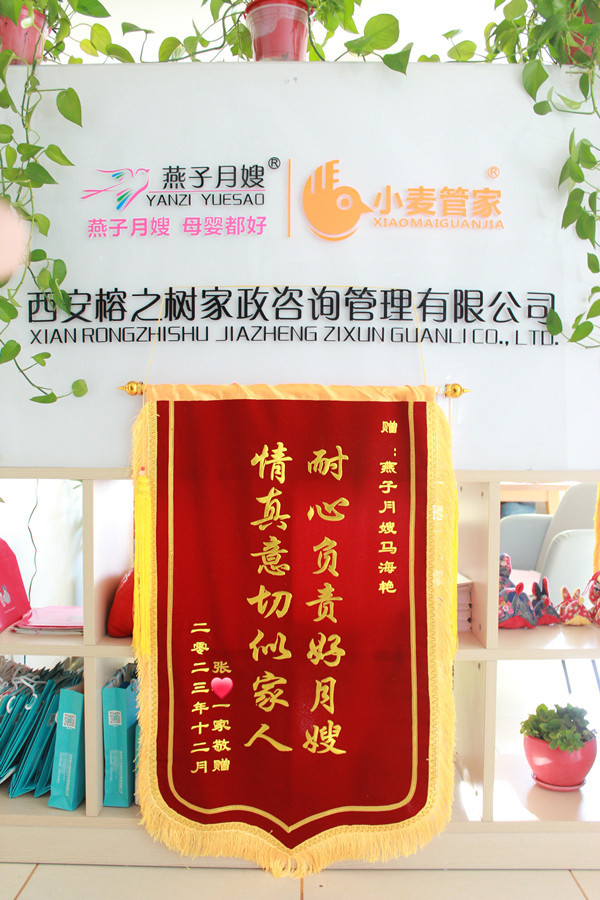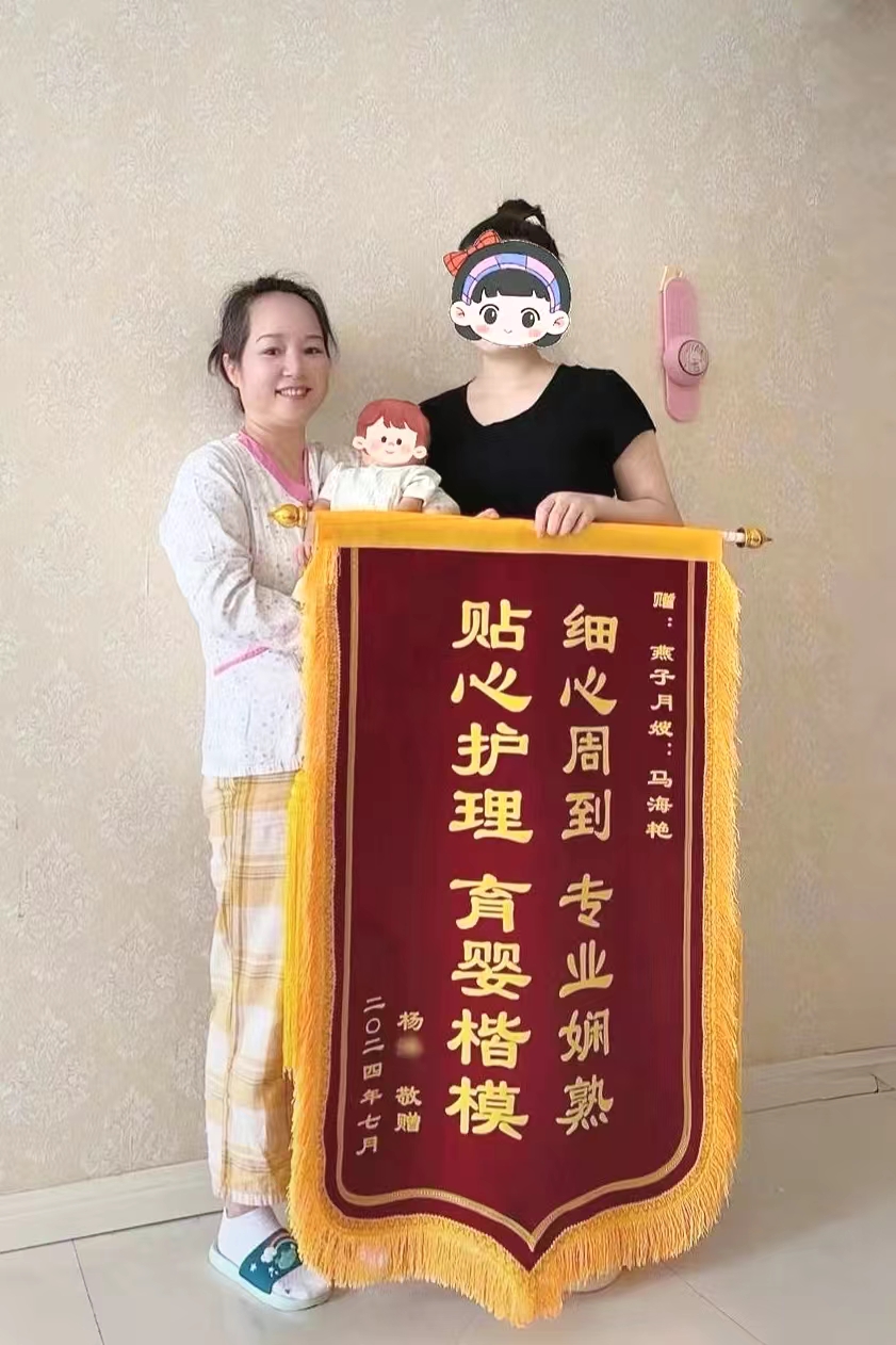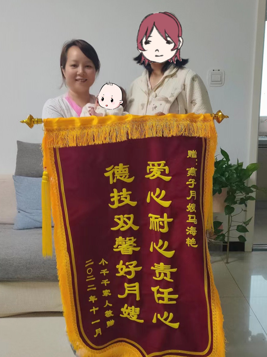 黃老師,馬姐在上戶期間對我和寶寶悉心照顧,盡職盡責,我和家人非常滿意。時間過的真快,一轉眼我也快出月子了,馬姐也要下戶了,非常珍惜這短暫的緣分。特此敬贈馬姐錦旗一面,以表我和家人對馬姐和貴公司的感謝感恩,同時也是對馬姐工作的認可和支持!!!